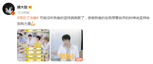 在《拜托了冰箱》中談到做特約演員的經(jīng)歷,曾經(jīng)有一段時間想要放棄,爸爸只對自己說了兩個字“堅持”,瞬間有了力量。